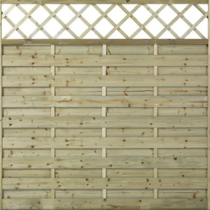 Plus tuinscherm recht vuren groen geimpregneerd uit de serie Bergen. Met trellis. De afmetingen van dit scherm zijn 180 x 180 cm (b x h). RVS geschroefd.