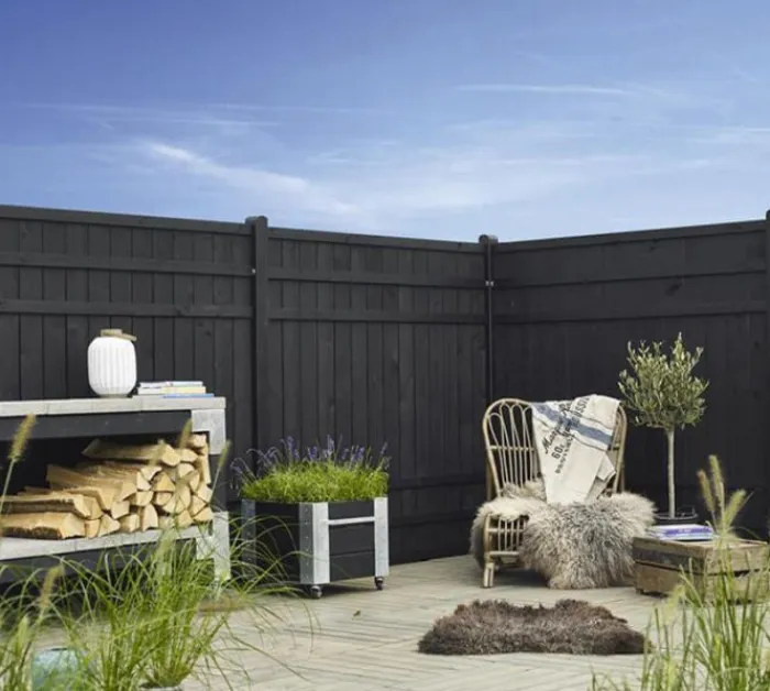 Plus tuinscherm recht vuren geïmpregneerd en zwart afgelakt uit de serie Rustik. Met ruw oppervlak. De afmetingen van dit scherm zijn 180 x 158 cm (b x h). RVS geschroefd.