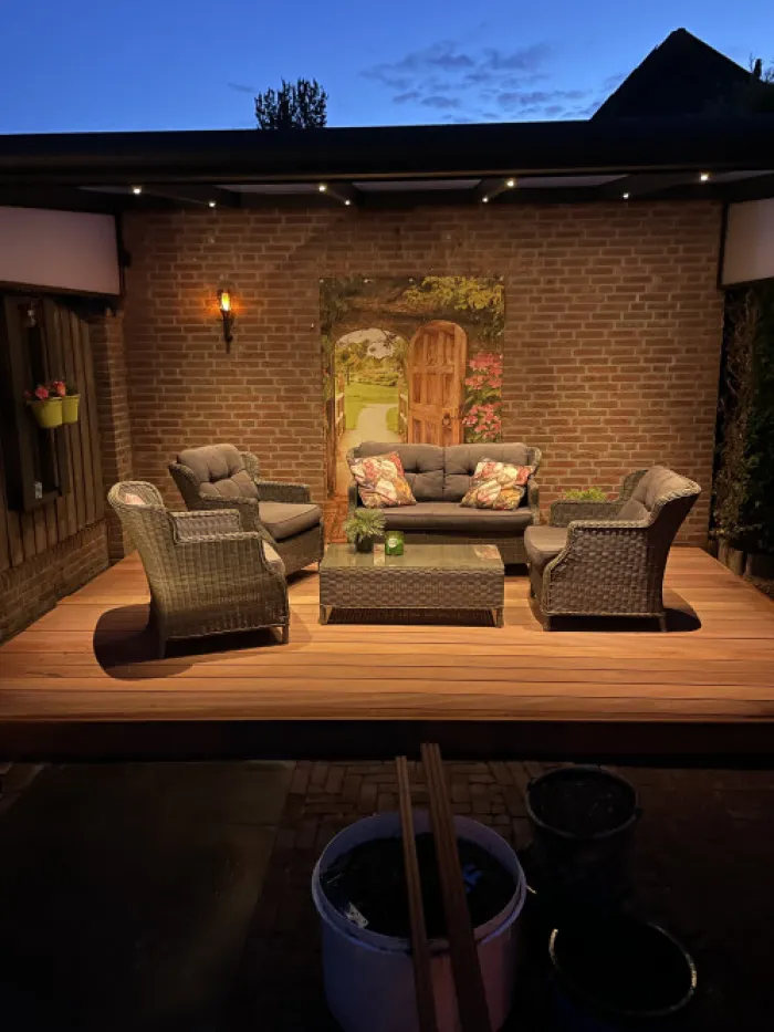 Smaragd vlonderplank totaalpakket hardhout Bankirai 2,1 x 14,5 cm (4,30 mtr) groef/vlak. Vlonder totaalpakket voor 1m2 gelegd met vlonderplanken van 430 cm. Dit pakket bevat 1 m2 planken, inclusief schroeven. Per m2 zit er ongeveer 2,7 strekkende meter onderbalk bij (lengte van de onderbalken is 300 cm). De terrasplank is 2-zijdig geprofileerd en kan naar eigen voorkeur gemonteerd worden.