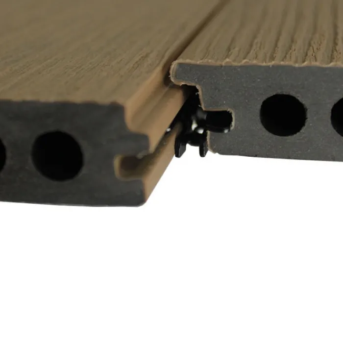C-Wood vlonderplank semi massief co-extrusie 2,1 cm dik en 14 cm brede terrasplank Sunset Teak (bruin) naadloos – eenzijdig te monteren. Deze semi massieve vlonderplanken hebben een speciale ‘shiplap’ profiel. Dit houdt in dat er een mooie overlapping zit in de vlonderplanken. De planken hebben een co-extrusie laag. De composiet vlonderplanken houtnerf zijn onderhoudsvrij, veranderen niet van kleur en zijn gemaakt van gerecyclede materialen.