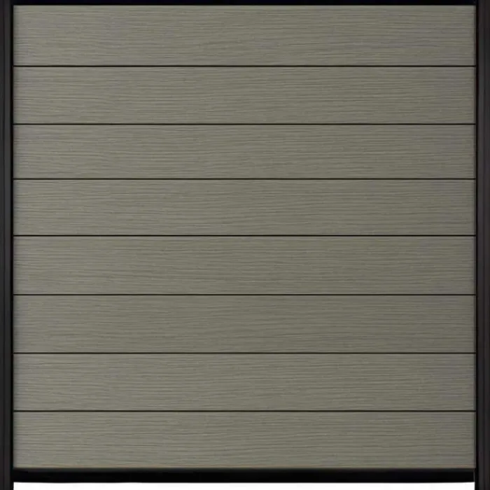 C-Wood zelfbouw schutting composiet Modular co-extrusie grijs met zwart aluminium accessoires. Geschikt om een scherm te maken van 180 cm hoog en maximaal 180 cm breed. De breedte is eenvoudig in te korten. De netto hoogte van het scherm is enkele centimeters lager dan de opgegeven 180 cm.