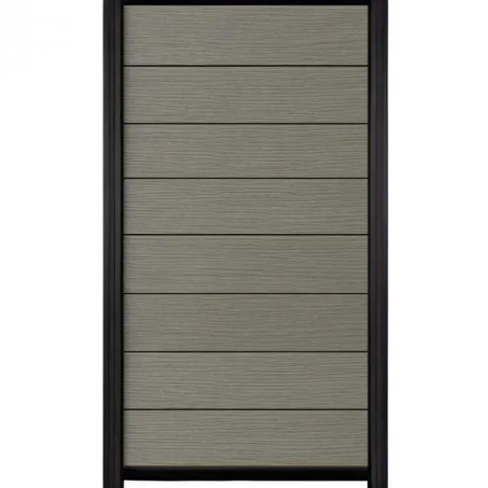 C-Wood zelfbouw schutting composiet Modular co-ex grijs met zwart aluminium accessoires. Geschikt om een scherm te maken van 180 cm hoog en maximaal 90 cm breed. De breedte is eenvoudig in te korten.