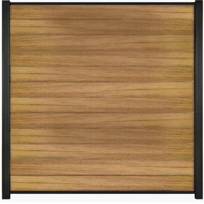 C-Wood zelfbouw schutting hardhout Mix & Match Ipé met zwart aluminium accessoires. Afmeting is 180 x 180 cm. De schuttingdelen schuif je van bovenaf tussen de C-Wood Modular / Mix & Match palen. De volgorde van de verschillende planken kan je zelf bepalen. Je begint onder en eindigt bovenop. De netto hoogte van deze schutting is enkele centimeters lager dan de opgegeven 180 cm.