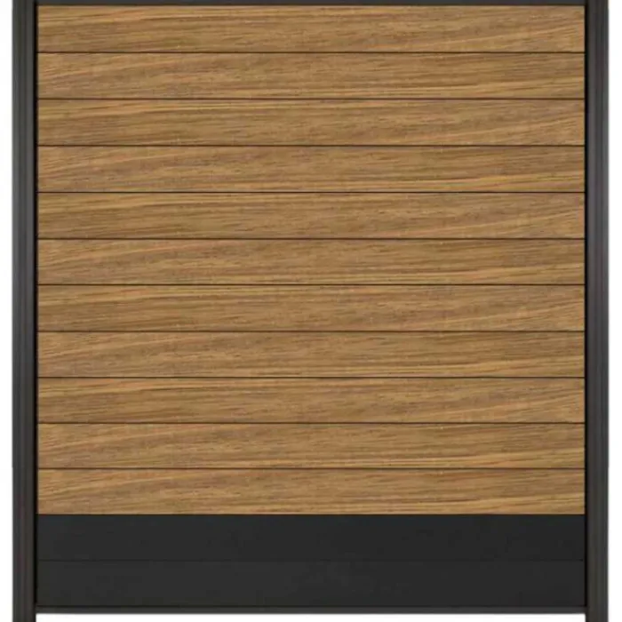 C-Wood zelfbouw schutting hardhout Mix & Match Thermo Fraké / antraciet met antraciet aluminium accessoires. Afmeting is 180 x 200 cm. De schuttingdelen schuif je van bovenaf tussen de C-Wood Modular / Mix & Match palen. De volgorde van de verschillende planken kan je zelf bepalen. Je begint onder en eindigt bovenop. De netto hoogte van deze schutting is enkele centimeters lager dan de opgegeven 200 cm.