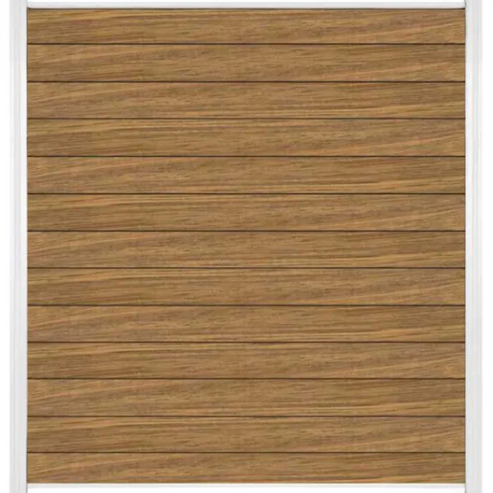 C-Wood zelfbouw schutting hardhout Mix & Match Thermo Fraké met wit aluminium accessoires. Afmeting is 180 x 200 cm. De schuttingdelen schuif je van bovenaf tussen de C-Wood Modular / Mix & Match palen. De volgorde van de verschillende planken kan je zelf bepalen. Je begint onder en eindigt bovenop. De netto hoogte van deze schutting is enkele centimeters lager dan de opgegeven 200 cm.