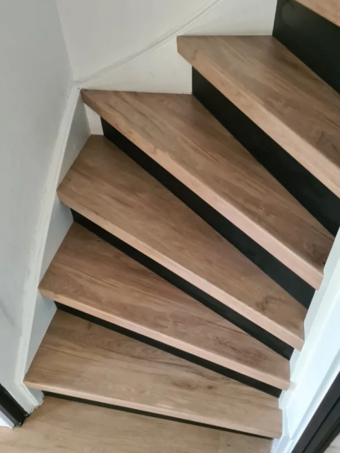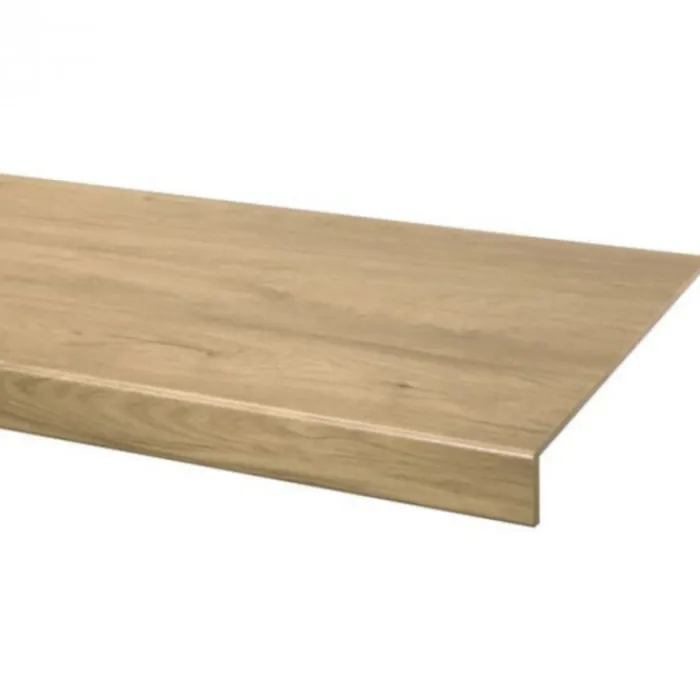 Overzettrede met neus – Laminaat – Burgos eiken truffel. Voor de rechte treden van de trap zijn er overzettreden beschikbaar van 100 x 30 cm. Voor de grotere traptreden in huis waar een draai in zit, zijn er overzettreden van 130 x 38 cm beschikbaar.