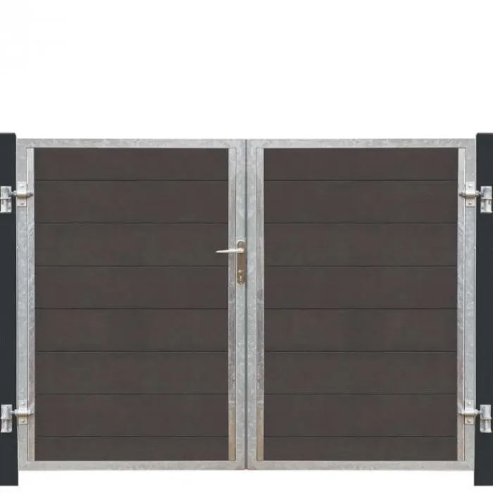 De antraciet kleurige dubbele tuindeur met stalen frame heeft lamellen gemaakt van composiet. De dubbele tuindeur is makkelijk schoon te maken. Het frame is gemaakt van thermisch verzinkt staal. De dubbele tuindeur heeft een afmeting van 99 x 180 cm. De zwart/grijze palen worden meegeleverd. Hierdoor komt je uit op een afmeting van 213 x 180 cm (2x 16 cm palen). De deur gaat naar links open.