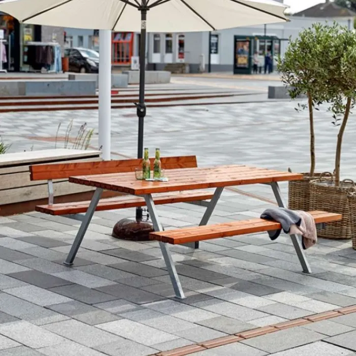 Plus Danmark Picknickset vuren Alpha gegrond teak (RAL 1006) hout. Geschikt voor 4 personen. Verkrijgbaar in diverse uitvoeringen. Het tafelblad heeft een lengte van 118 cm, breedte van 76 cm en een hoogte van 73 cm. De banken zijn 118 cm lang, 24,5 cm breed en 45 cm hoog. Met een rugleuning is de hoogte 76 cm. De picknicktafel wordt geleverd incl. schroeven en bouten.