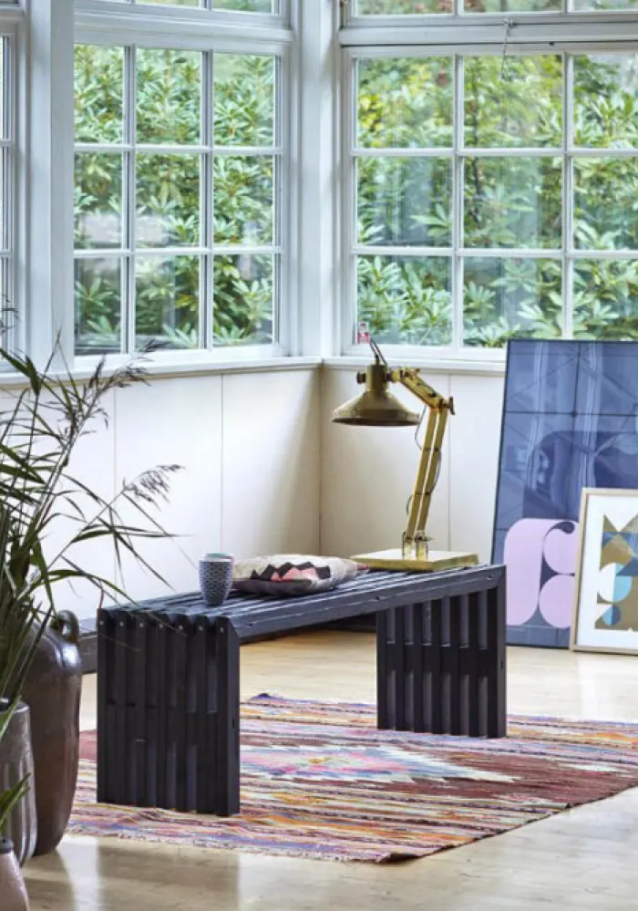 Plus Danmark tuinbank Rustik. Deze bank is gemaakt van dennenhout en is zwart gebeitst met een verf op waterbasis. Kleur benaderd RAL 9005. Bouwpakket, deels voorgemonteerd, zelf in elkaar zetten