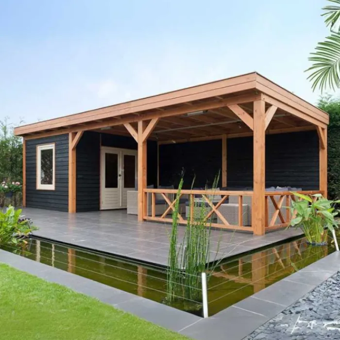 Trendhout buitenverblijf Refter XL. Dit is het basis model van 4,00 meter diep en beschikbaar in diverse breedte maten. Wil je dit buitenverblijf helemaal naar eigen wens samen stellen klik dan op de knop hierboven en ontwerp je buitenverblijf in de 3D configurator.