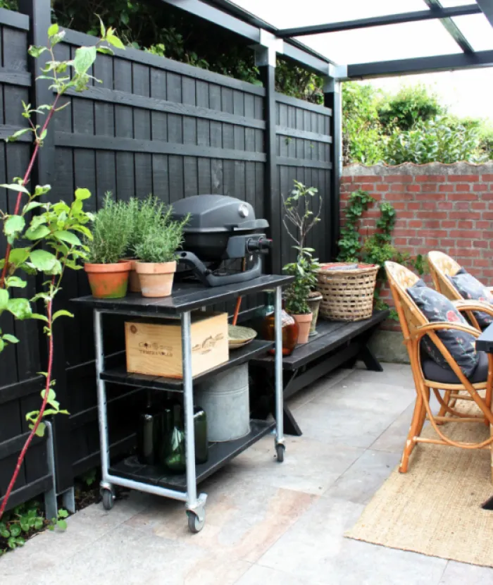 Plus tuinscherm recht vuren geimpregneerd en zwart afgelakt uit de serie Rustik. Met ruw oppervlak. De afmetingen van dit scherm zijn 180 x 180 cm (b x h). RVS geschroefd.