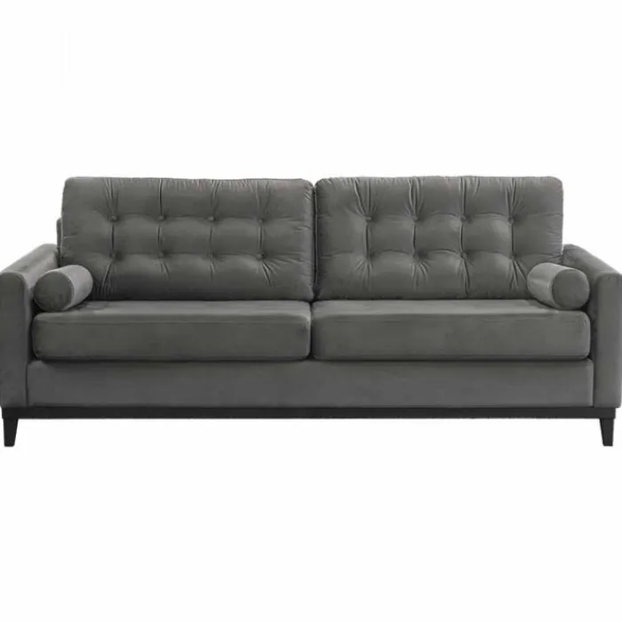Deze vintagelook 3 zitsbank met decoratieve knopen in de rugkussens en in de zitting, is uitgevoerd in de stof Riviera antraciet. Deze stof is fluweel zacht en heeft een lichte glans waardoor deze bank een opvallende en rijke uitstraling heeft. Daardoor is deze bank uitermate geschikt voor ieder interieur. De Knapp heeft een stevig zitcomfort met een rechte rugleuning. Deze bank heeft 2 rugkussen, 2 zitkussen en 2 ronde kussentjes bij de armleuning voorzien van een rits.