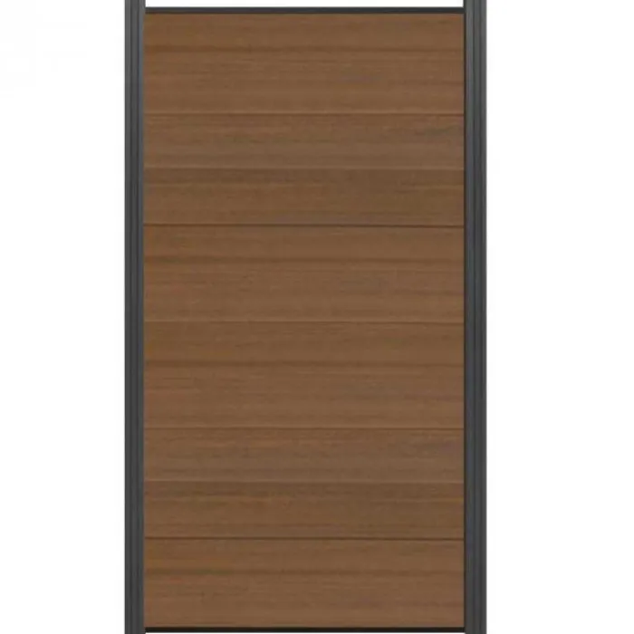 Schutting composiet co-extrusie Como teak met antraciet aluminium kader (90 x 180 cm). Deze schutting wordt geleverd als een zelfbouw pakket waarmee je zelf een unieke schutting kunt maken.