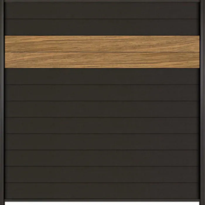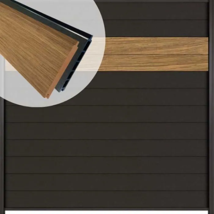 De C-Wood Mix & Match serie maakt het mogelijk om zelf je eigen schutting samen te stellen, waarbij er gekozen kan worden uit verschillende lamellen. In de foto zijn 2 lamellen Thermo Fraké en 10 lamellen composiet antraciet gebruikt. Afgewerkt met antraciet onder- & bovenregels.