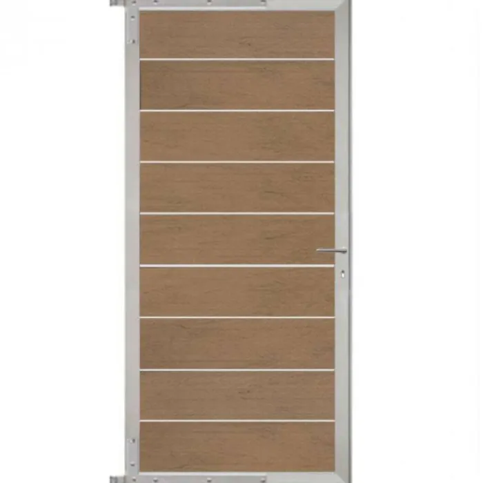 C-Wood zelfbouw tuindeur aluminium blank frame Modular – composiet bruin gevlamd. Afmeting 90 x 200 cm. De hoogte van de tuindeur is enkele centimeters lager dan de opgegeven 200 cm. De tuindeur wordt geleverd inclusief deurbeslag.