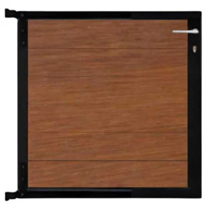 C-Wood zelfbouw tuinpoort aluminium zwart frame Mix & Match – hardhout Bamboe (90 x 90 cm). De netto hoogte van deze tuinpoort is enkele centimeters lager dan de opgegeven 90 cm. De poort wordt geleverd inclusief deurbeslag.