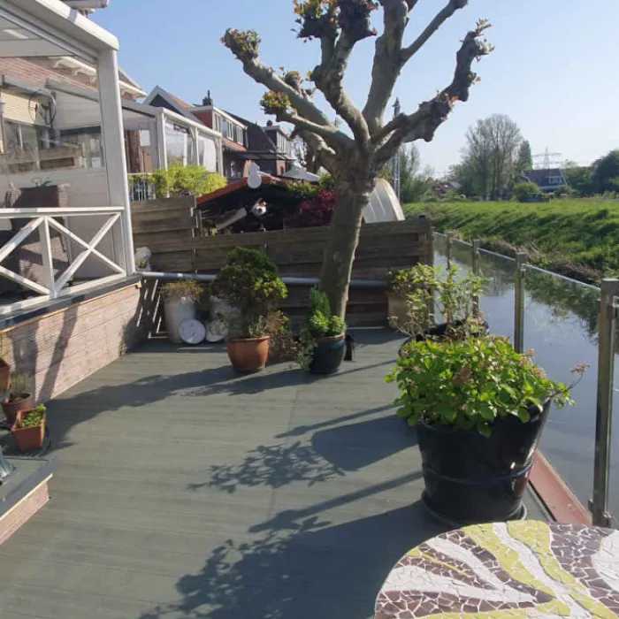 Vlonder totaalpakket voor 1m2 gelegd met Pure Jade composiet vlonderplanken van 400 cm, 2,1 cm dik en 14,0 cm breed. Dit pakket bestaan uit vlonderplanken, onderbalken, clips en schroeven om de vlonderterras te maken. Vul het benodigd aantal vierkante meter terras in en de website rekent automatisch uit hoeveel planken je ontvangt. Bij dit pakket wordt geen rekening gehouden met snijverlies. Leg je je terras in een halfsteenpatroon, bestel dan extra onderbalken mee. De vlonderplank is eenzijdig te gebruiken.