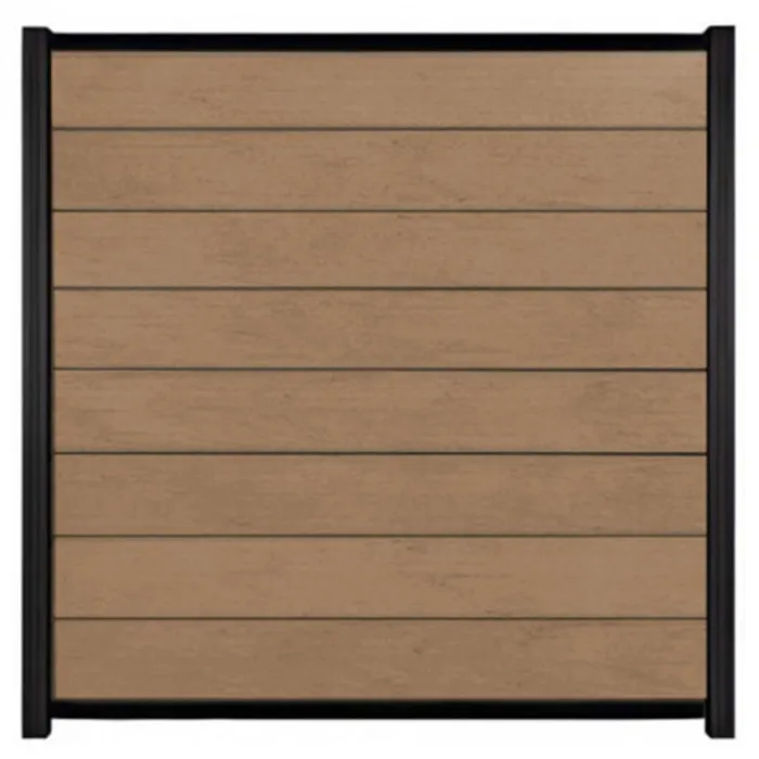 C-Wood zelfbouw schutting composiet Modular teak met zwart aluminium accessoires. Geschikt om een scherm te maken van 180 cm hoog en maximaal 180 cm breed. De breedte is eenvoudig in te korten. De netto hoogte van het scherm is enkele centimeters lager dan de opgegeven 180 cm.