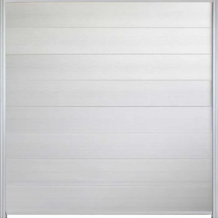 C-Wood zelfbouw schutting composiet Modular wit met blank aluminium accessoires. Geschikt om een scherm te maken van 180 cm hoog en maximaal 180 cm breed. De breedte is eenvoudig in te korten. De netto hoogte van het scherm is enkele centimeters lager dan de opgegeven 180 cm.