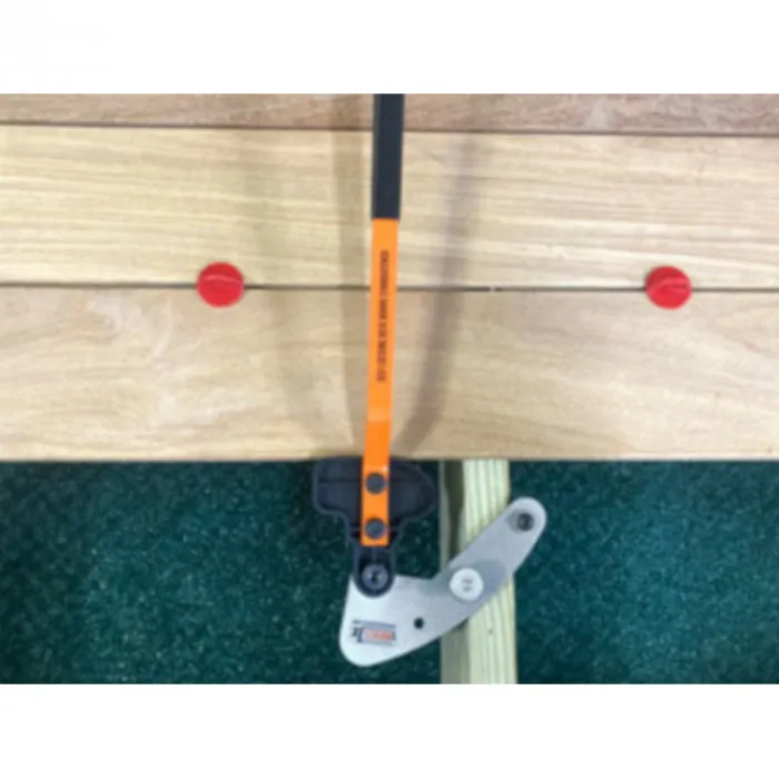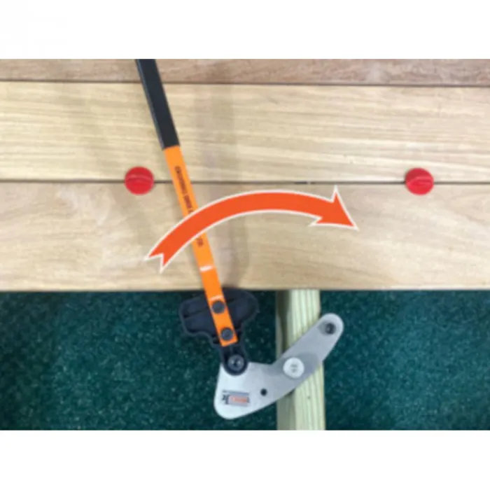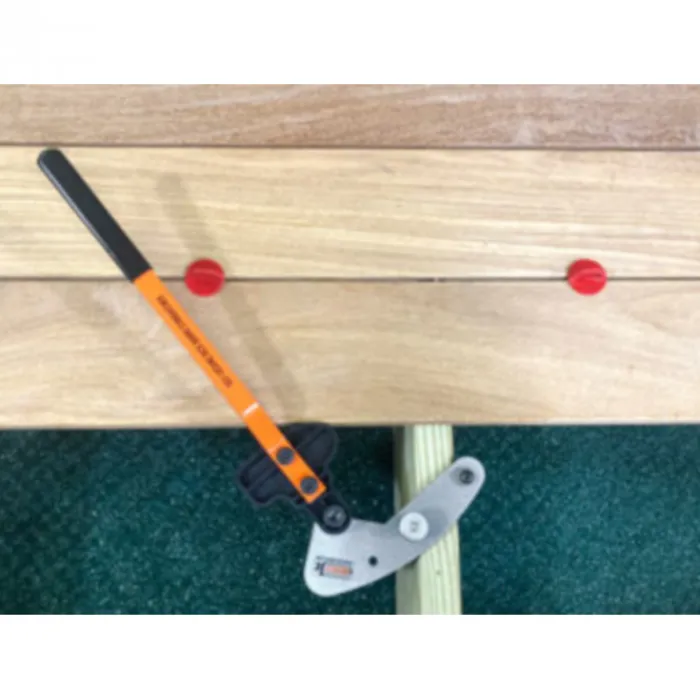Deckwise vlonder spanklem. Voor het makkelijk monteren van vlonderplanken. Met deze spanklem krijg je ook kromme vlonderplanken eenvoudig op zijn plaats.
