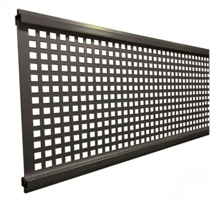 Decoratief antraciet aluminium rooster met antraciet frame. Afmeting: 180 x 21 cm. Decoratieve optie ter vervanging van één van de composiet lamellen. Speciaal voor het modulaire systeem.