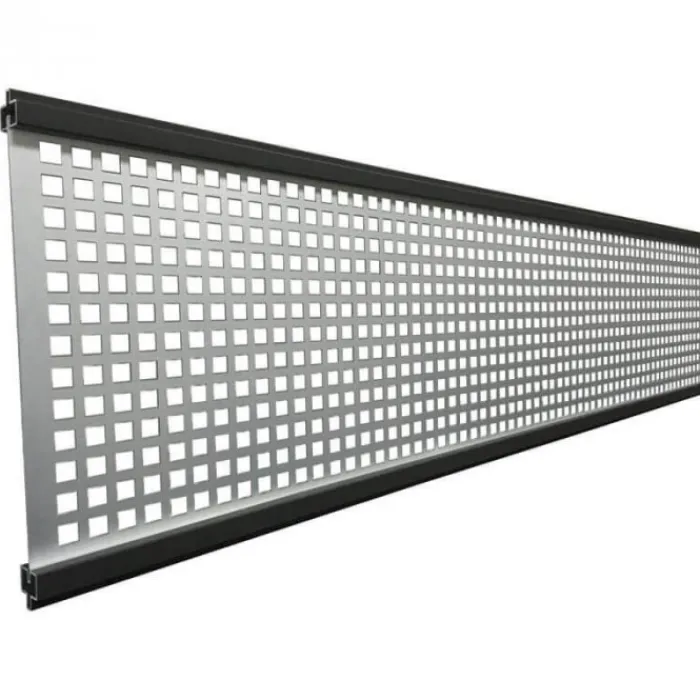 Decoratief aluminium rooster met antraciet frame. Afmeting: 180 x 21 cm. Decoratieve optie ter vervanging van één van de composiet lamellen. Speciaal voor het modulaire systeem.
