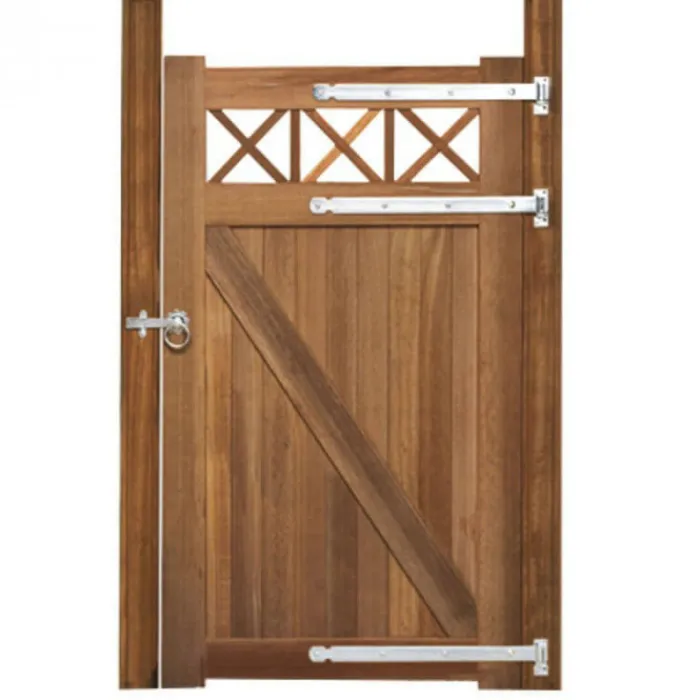 De poort wordt geleverd inclusief 3 hengen en duimen, om de poort te monteren aan een paal. Voor sluiting zit er een rozetklinkstel bij.