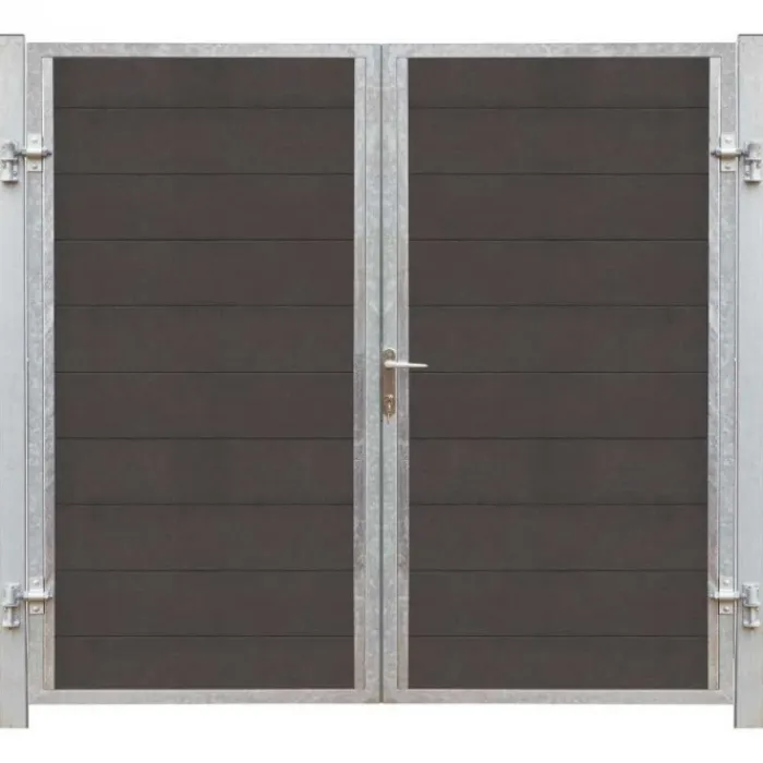 De antraciet kleurige dubbele tuindeur met stalen frame heeft lamellen gemaakt van composiet. De dubbele tuindeur is makkelijk schoon te maken. Het frame is gemaakt van thermisch verzinkt staal. De dubbele tuindeur heeft een afmeting van 99 x 180 cm. De palen worden meegeleverd. Hierdoor komt je uit op een afmeting van 213 x 180 cm (2x 16 cm palen). De deur gaat naar rechts open.
