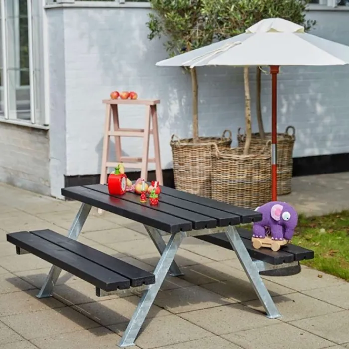 Plus Kinderpicknicktafel vuren gegrond zwart | Alpha 118 x 177 x 57 cm. Kinderpicknicktafel Alpha is gegrond in de kleur zwart (RAL 9005). De tafel is geschikt voor 10 kinderen. Het frame is gemaakt van thermisch verzinkt staal. Het tafelblad heeft een lengte van 177 cm, breedte van 50 cm en een hoogte van 57 cm. De banken zijn 177 cm lang, 24,5 cm breed en 32,5 cm hoog. De picknicktafel wordt geleverd incl. schroeven en bouten.