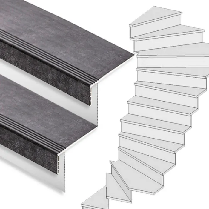Dit is een complete Stepwoord traprenovatieset met SPC toplaag traptreden en stootborden in de kleur beton zwart, inclusief montagekit en afwerkingskit. Deze complete set is geschikt voor een trap met 2 kwart draai met 13 treden. De set wordt geleverd inclusief stootborden, omdat het een set voor een dichte trap betreft.