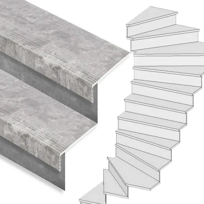 Dit is een complete Stepwoord traprenovatieset met SPC toplaag traptreden en stootborden in de kleur beton grijs, inclusief montagekit en afwerkingskit. Deze complete set is geschikt voor een trap met 2 kwart draai met 15 treden. De set wordt geleverd inclusief stootborden, omdat het een set voor een dichte trap betreft.